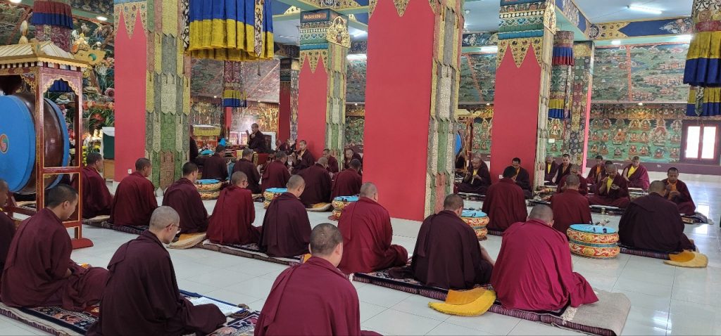 Following Losar, on Saturday, March 12th, 2022, Mindrolling Monastery began the great Thug Je Chenpo drubchen, or the Drubchen of the Great Compassionate One. This annual 7-day drubchen is performed every year in commemoration of the anniversary of the Parinirvana of Kyabje Minling Trichen. The Thug Je Chenpo terma was revealed by Chögyal Terdag Lingpa and it is considered to be especially beneficial during this era when merit and virtue are weak. Knowing that generation after generation of the Mindrolling lineage have manifested as the Great Compassionate One (Thug Je Chenpo) for the benefit of beings, each year the sangha of Mindrolling performs this profound mahasadhana with great joy and devotion and with the aspiration that the Dharma will continue to flourish and that the activities of our teachers will be as vast as the sky. The merit of this practice is dedicated to the benefit and liberation of all sentient beings and the continued flourishing of the Mindrolling lineage.