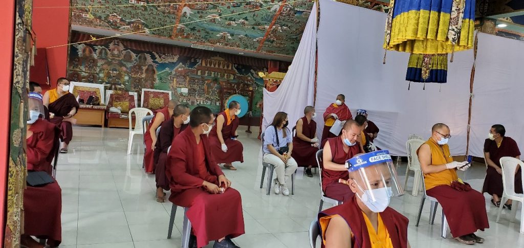 As India faced incredible challenges during the most recent wave of COVID-19, the administration team of Mindrolling Monastery worked tirelessly to protect the safety of the monks and the lay community. Facing such a crisis with shortages of so many needed supplies, the team did widespread testing, treated all those who tested positive and contained the spread of the virus using quarantines and contact tracing. After weeks of hard work, the spread of the virus within the Clement Town Tibetan Colony was contained and the safety of those in the colony has been successfully secured. Once the situation was controlled and the safety of the community had been secured, Mindrolling Monastery organized a huge vaccination effort to get the entire monastic community of Mindrolling and the Tibetan colony vaccinated. The clinic took place in the Guru Rinpoche shrine room of the stupa at Mindrolling Monastery.