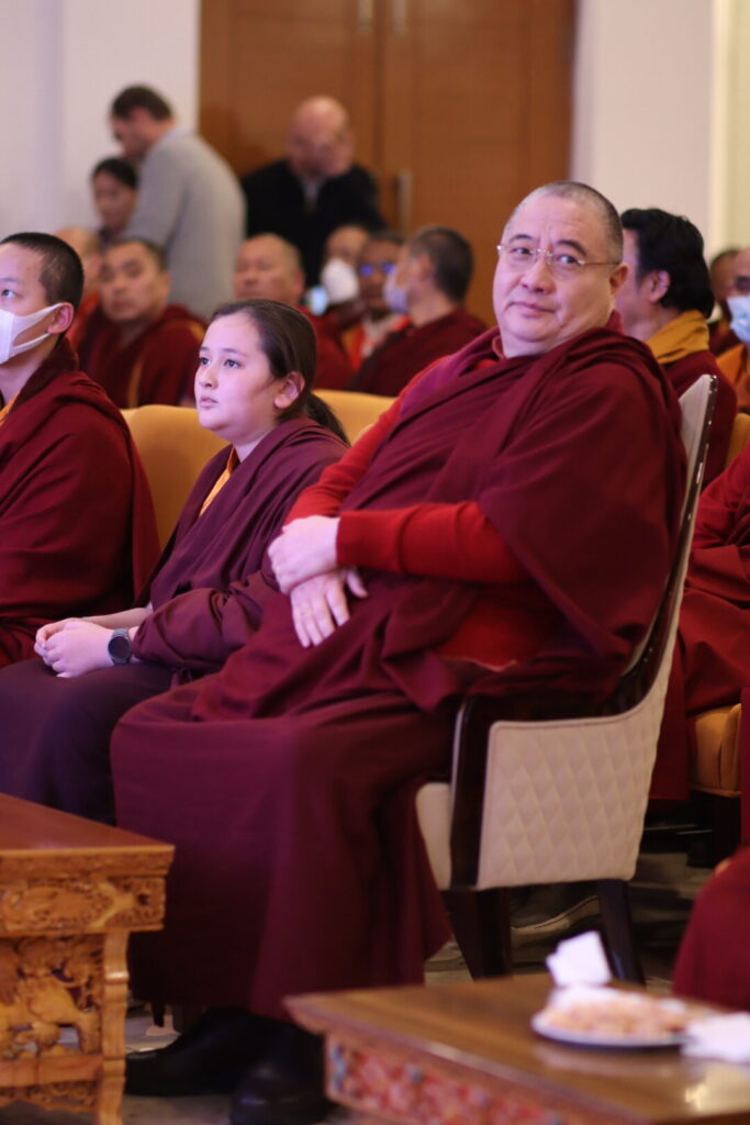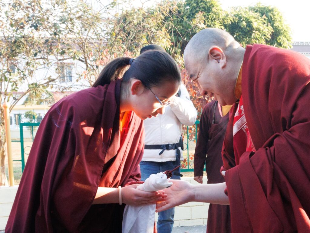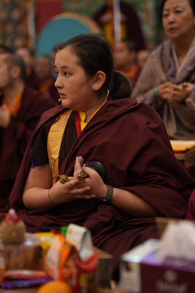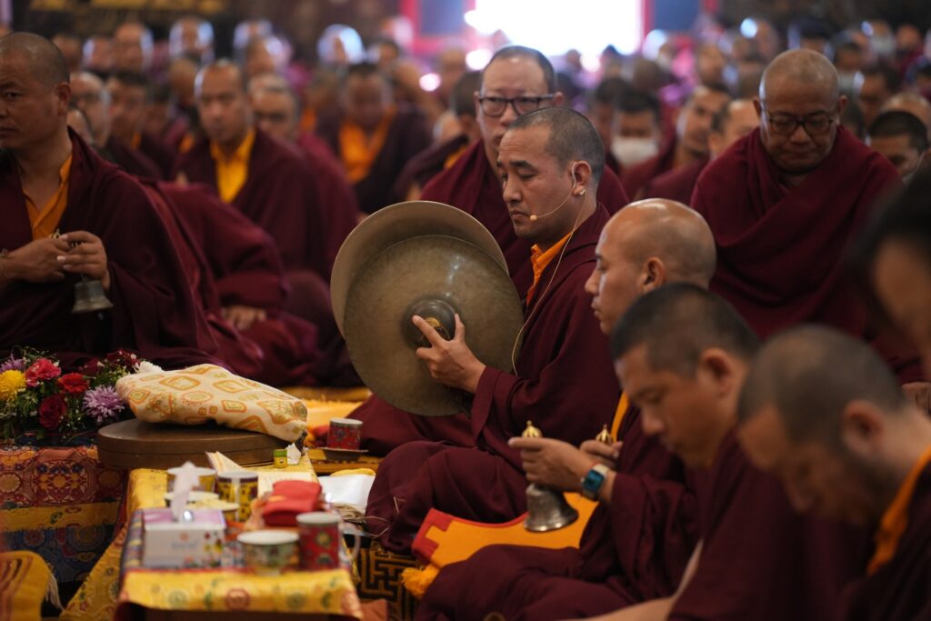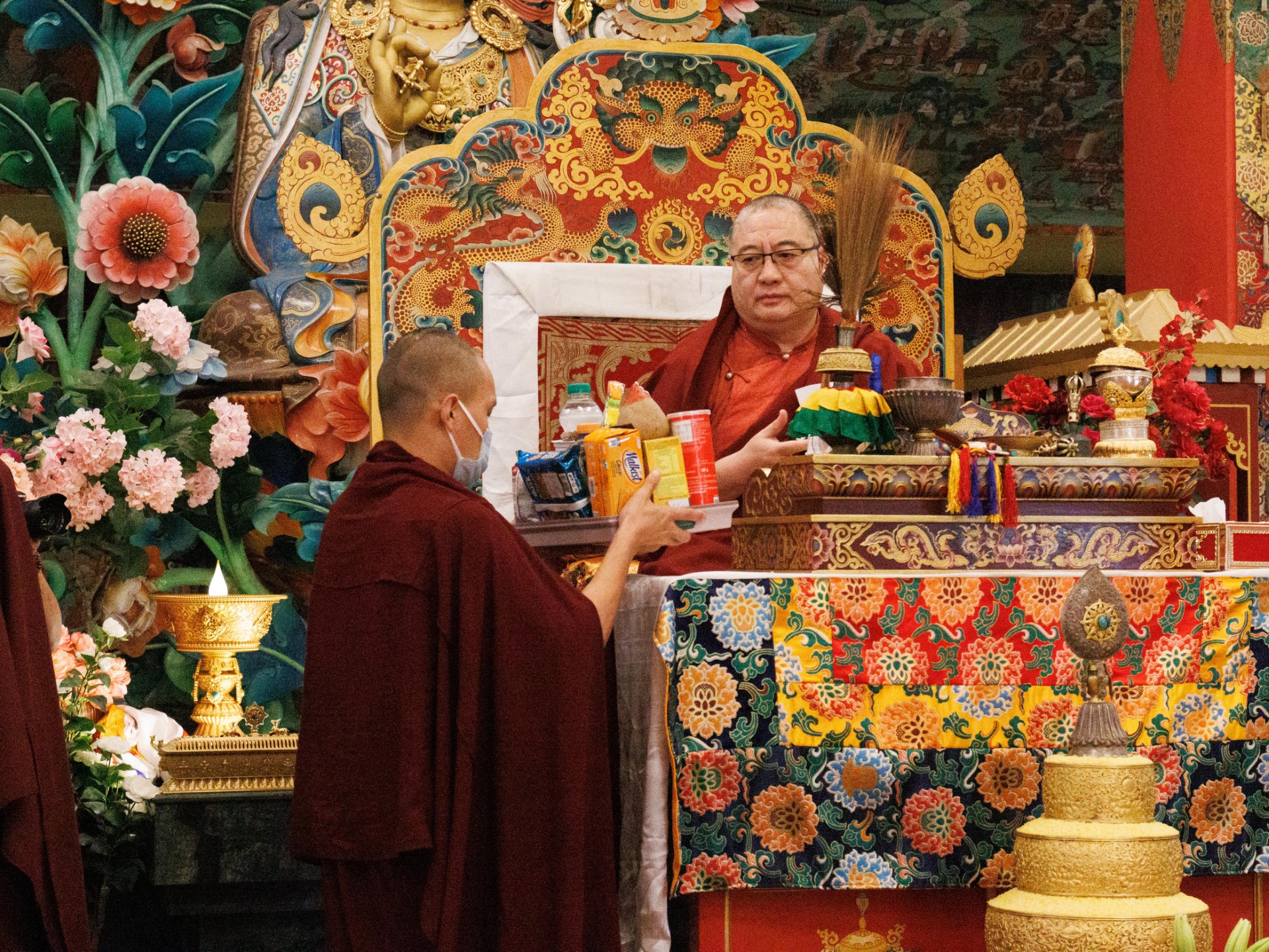 In the morning heartfelt gratitude was expressed to all those who made the transmissions possible, acknowledging the contribution of every individual – from the principal Mindrolling Administrators and Kama Organizers, to the teams of monks, nuns, and Western sangha, as well as all the staff members working hard in the kitchen, security, housekeeping, gardening, together with electricians, plumbers and carpenters. Special appreciation was also extended to the audio-visual team, whose dedicated efforts enabled the connection of spaces within the monastery and made several sessions accessible online to the worldwide sangha.