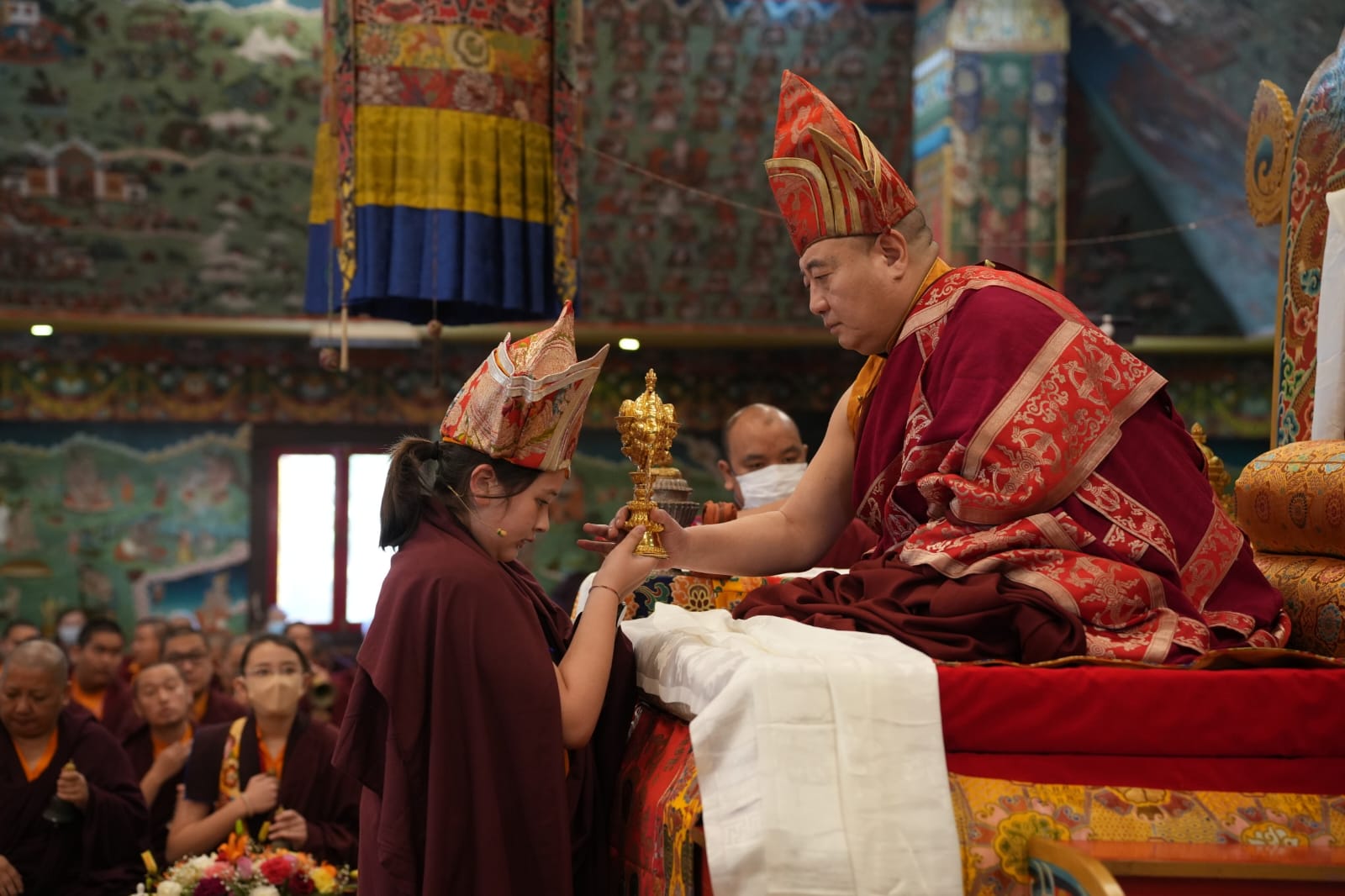 As the transmissions reached the section of the higher tantras, the young tulkus auspiciously bestowed the wangdrim all together. In a moment of historical significance, Minling Jetsün Rinpoche also joined the bestowal of the wangdrim, which was a most auspicious occasion, as in the history of the Dharma the Minling Jetsünmas have played a pivotal role in the preservation, protection, and continuation of the teachings.