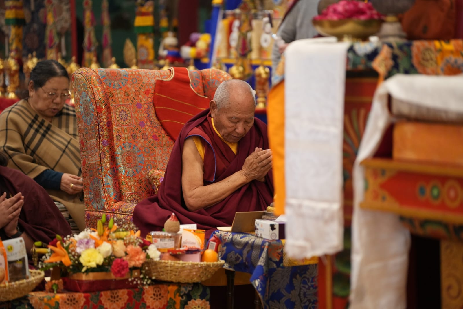 At the conclusion of the sacred Kama transmissions at Mindrolling Monastery, a traditional tenzhug, a long-life offering ceremony, was respectfully and joyfully offered for the long life of Kyabje ShechenRabjam Rinpoche with immense gratitude and heartfelt supplications for Rinpoche’s long life and vast Dharma activities. Minling Dungse Rinpoche presided over the tenzhug performing the sacred ritual of making extensive offerings of symbolic representations of longevity and formal verses of supplication. The ceremony culminated with the vast mandala offering led by Minling Jetsün Rinpoche, followed by the great assembly of Mindrolling sangha who presented sacred offerings of body, speech, and mind representations, along with an abundant variety of exquisite offerings.