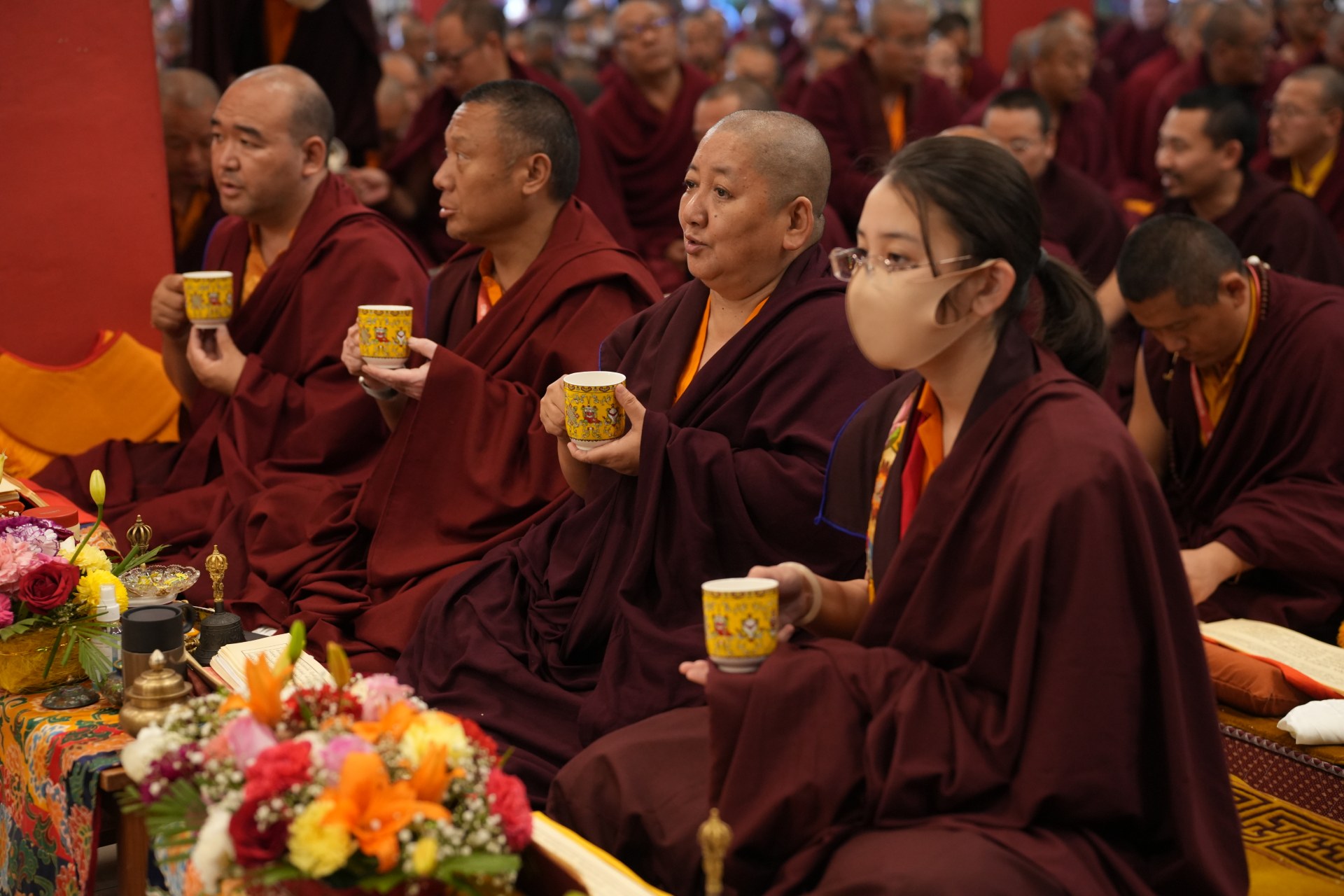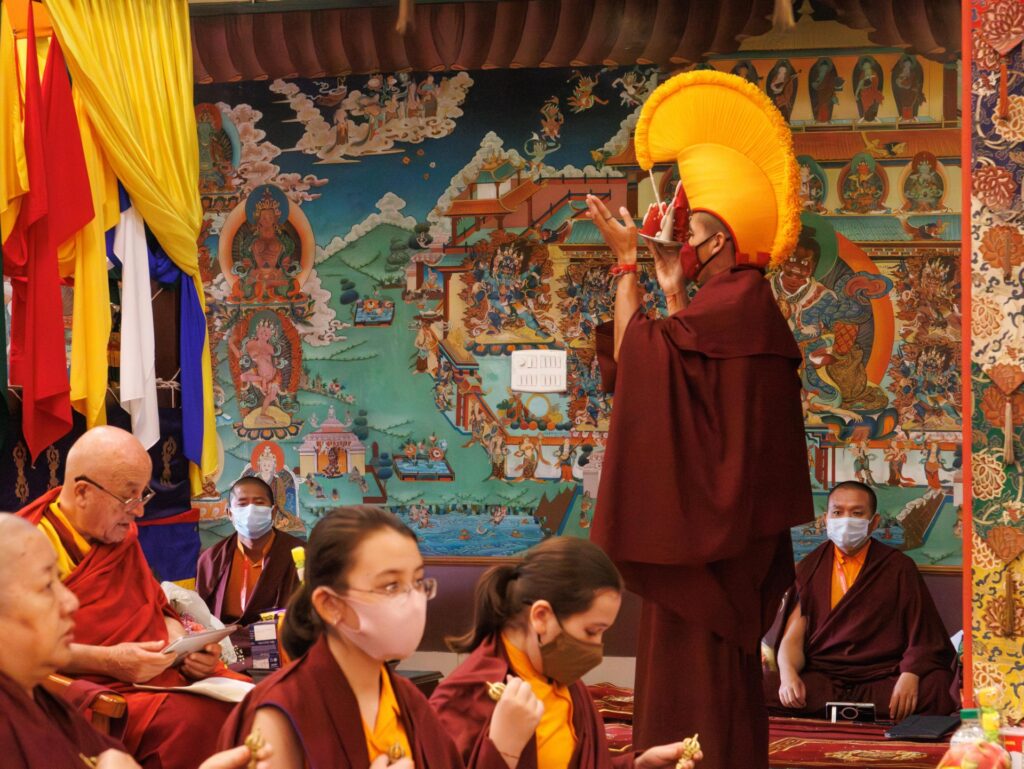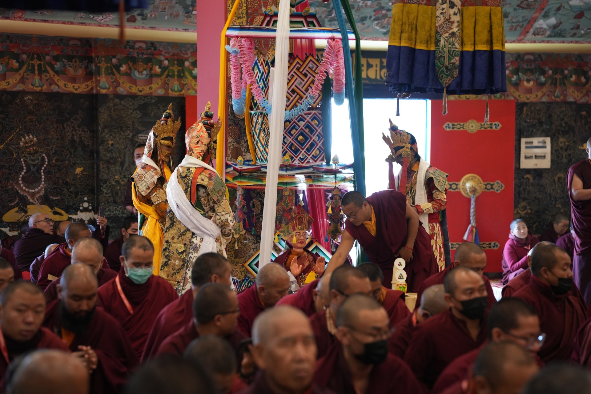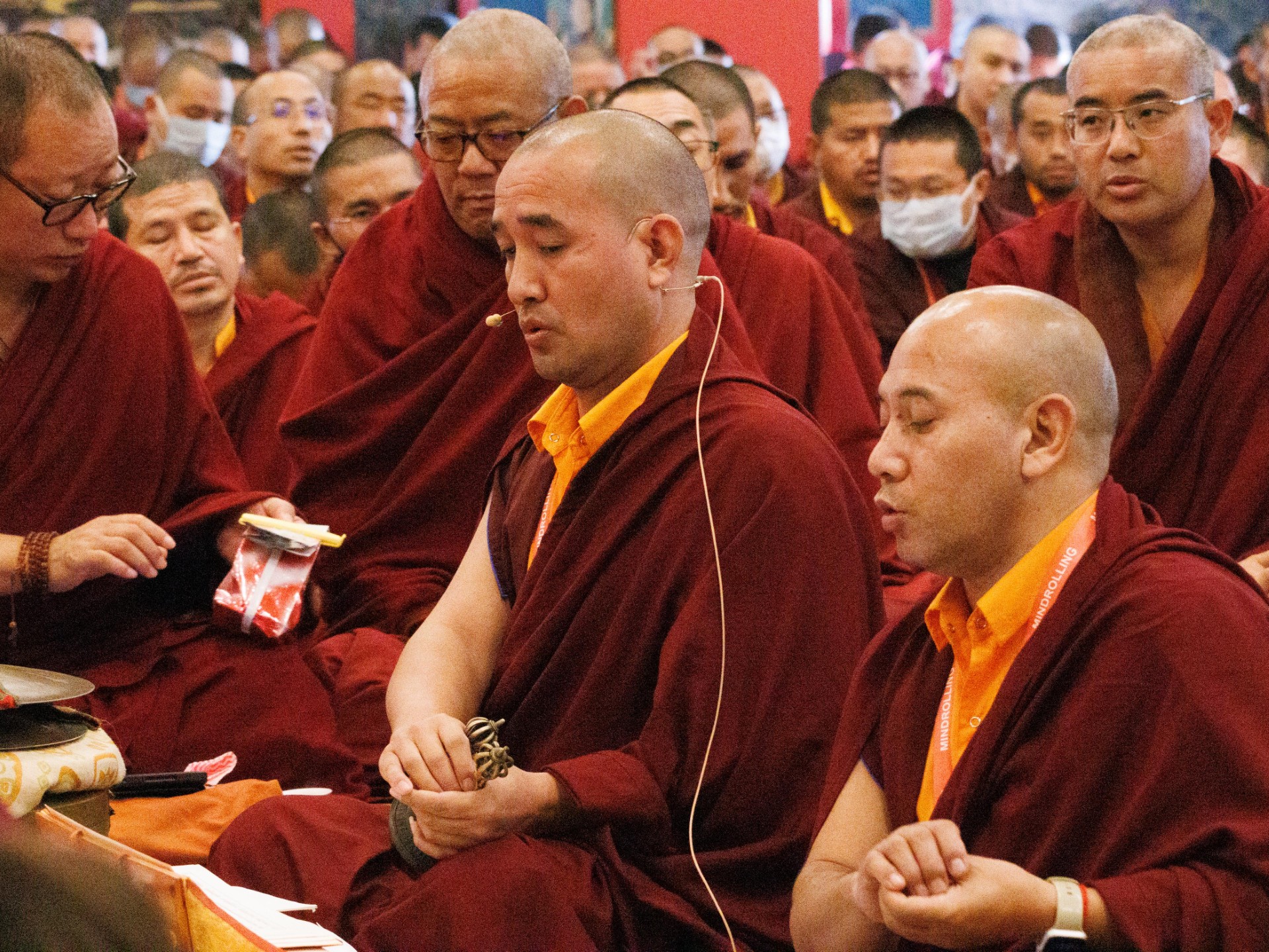 During these afternoon sessions, the young generation of teachers, yangsis, and tulkus performed the wangdrim, bestowing the empowerment articles to each person in the assembled sangha.