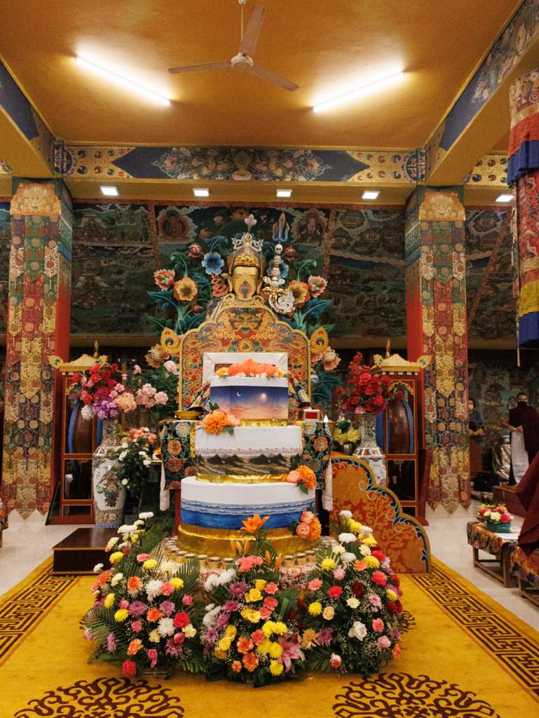 On the 25th of December, the birthday of Shechen Rabjam Rinpoche was joyfully celebrated by the gathered rinpoches, monks, and nuns and the lay sangha. In the shrine room a grand birthday cake was brought forth. Following the prayers and supplications, vast offerings of mandala and tensum were made several times. The offering by Mindrolling Monastery was made by the young rinpoches and Mindrolling masters. This was followed by Shechen Monastery, who supplicated for Kyabje Rinpoche’s long life with mandala offering and tensum.