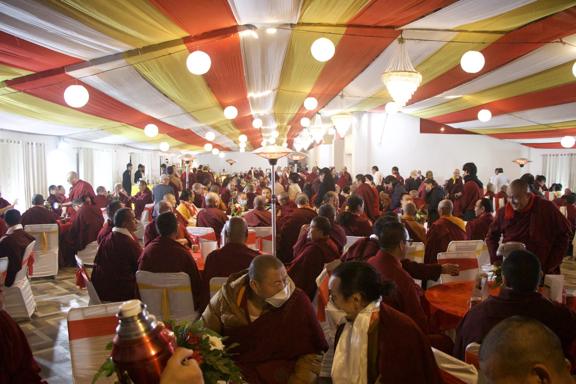 On the 29th of December, the auspicious 10th lunar day of the 11th Tibetan month, Mindrolling Monastery performed a tshog, or feast, offering in conjunction with the ongoing Kama transmissions. With Kyabje Rabjam Rinpoche presiding, the entire assembly, who were gathered for the Kama empowerments and reading transmissions, joyously offered a vast ganacakra.