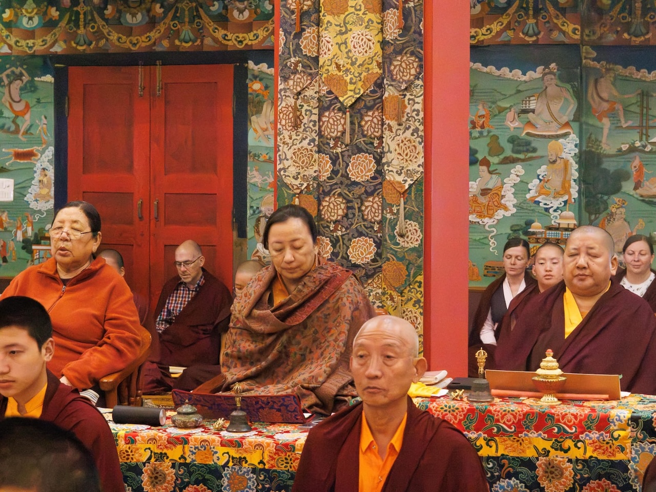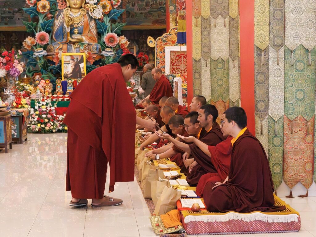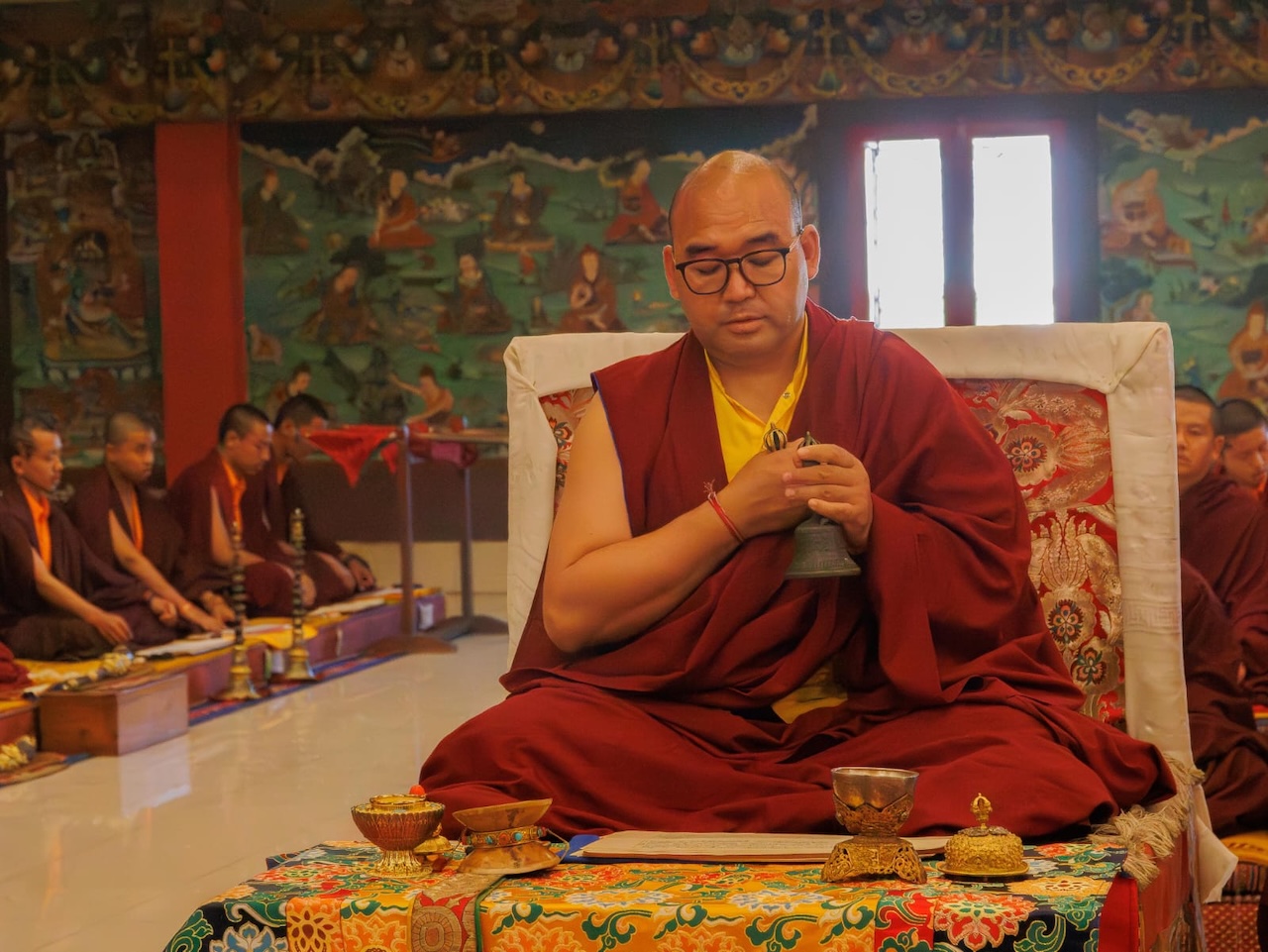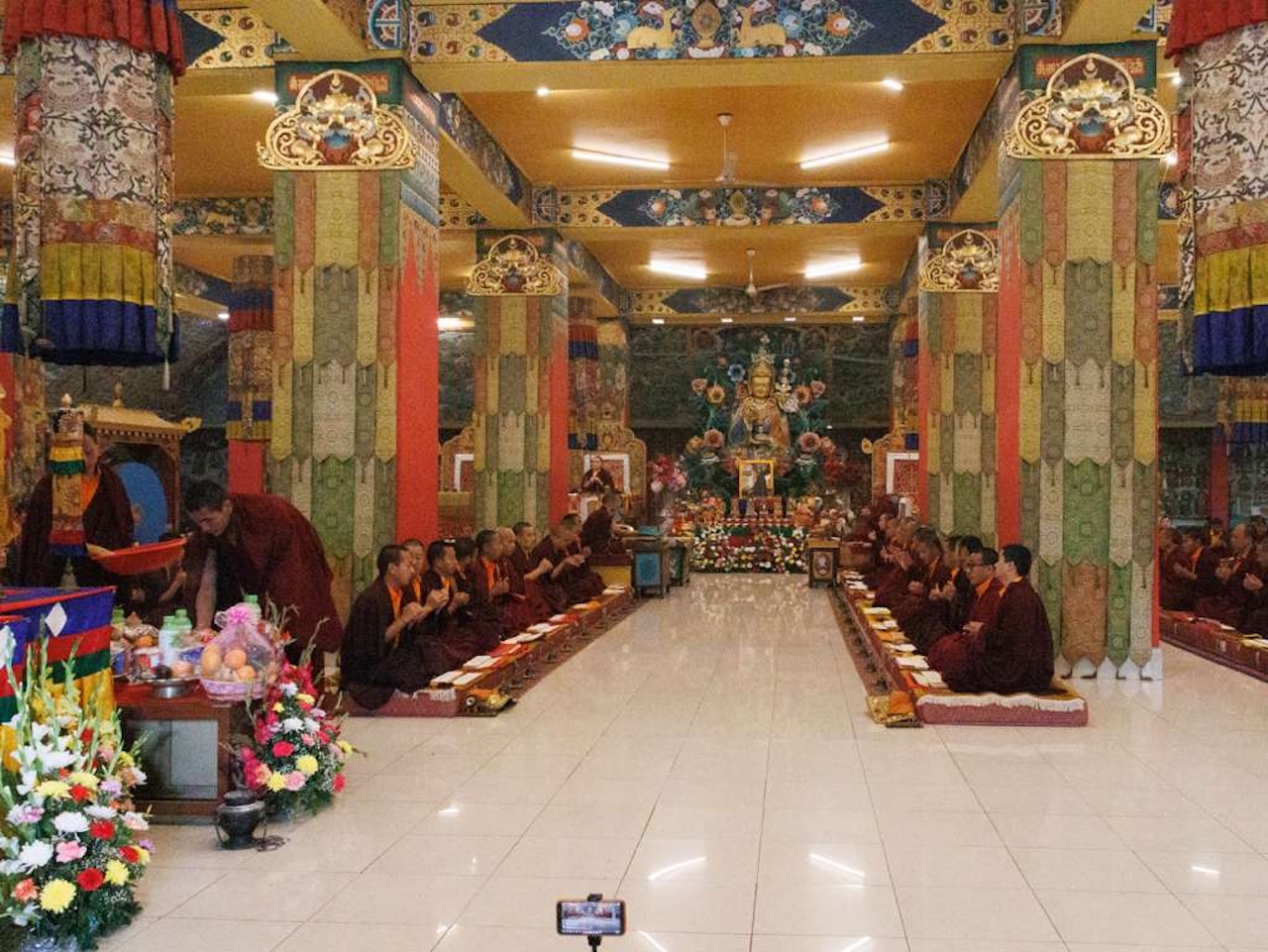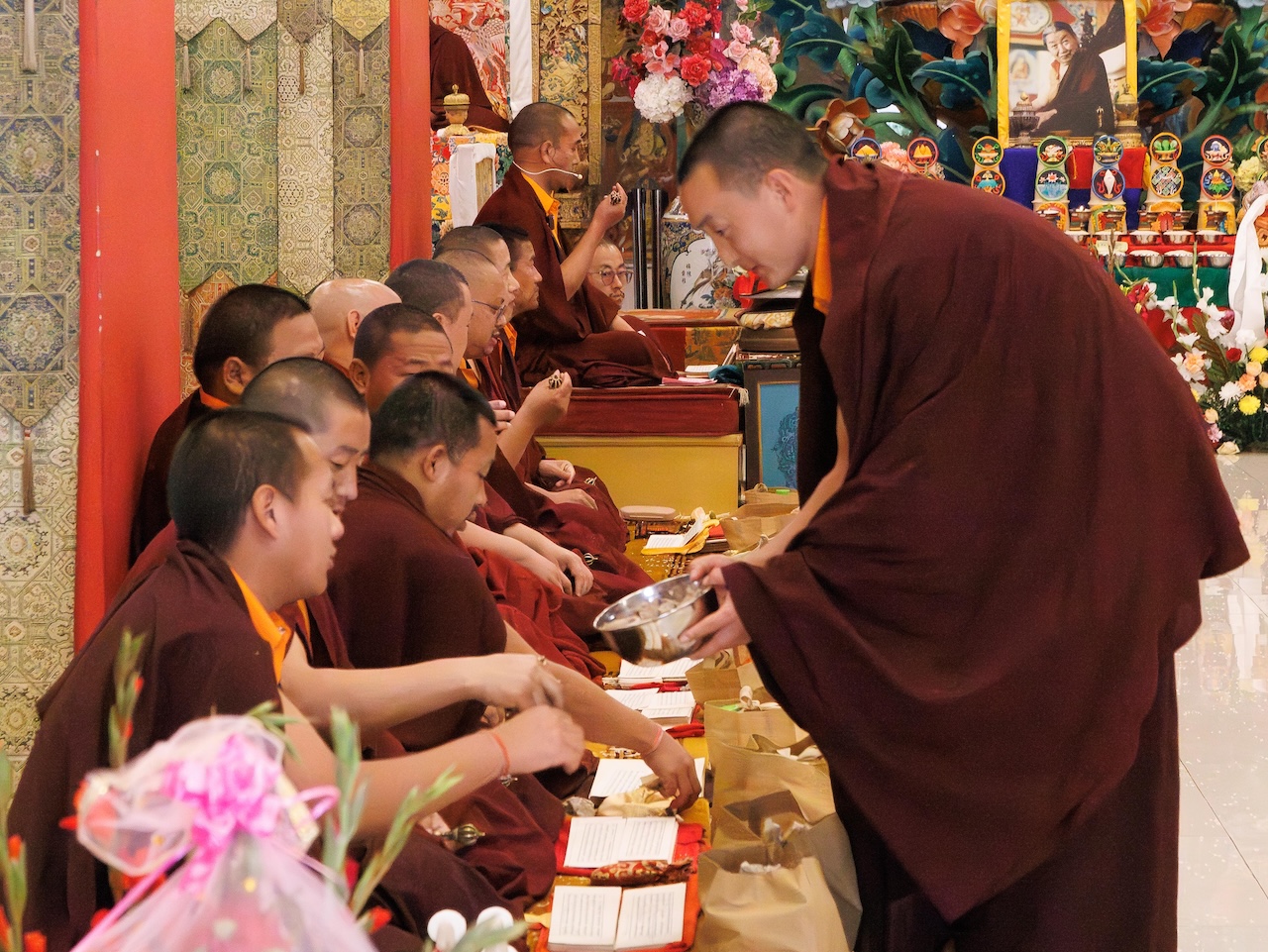 On the third day of Losar of the year of the Fire Horse, 2026, the sangha of Mindrolling gathered to make vast offerings of ganachakra (feast offerings) to mark the anniversary of the parinirvana of Kyabje Minling Trichen.  The assembly was led by Minling Dungse Rinpoche and included Minling Jetsün Rinpoche, Minling Jetsün Khandro Rinpoche, Minling Jetsün Dechen Paldrön, Sangyum Kushog, Venerable Khentrul Marpa Rinpoche and the other Mindrolling tulkus, khenpos, and monks, as well as nuns of Samten Tse, and Mindrolling International sangha members.  Many more sangha members who could not attend in person joined the practice on the internet by live stream.  The entire assembly joined together with great devotion to accomplish the vast ganacakra