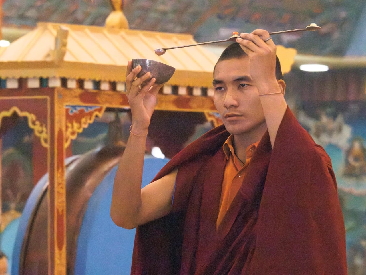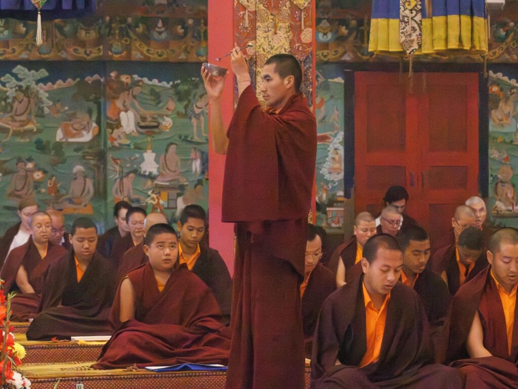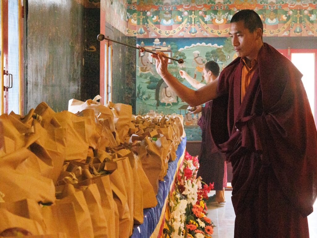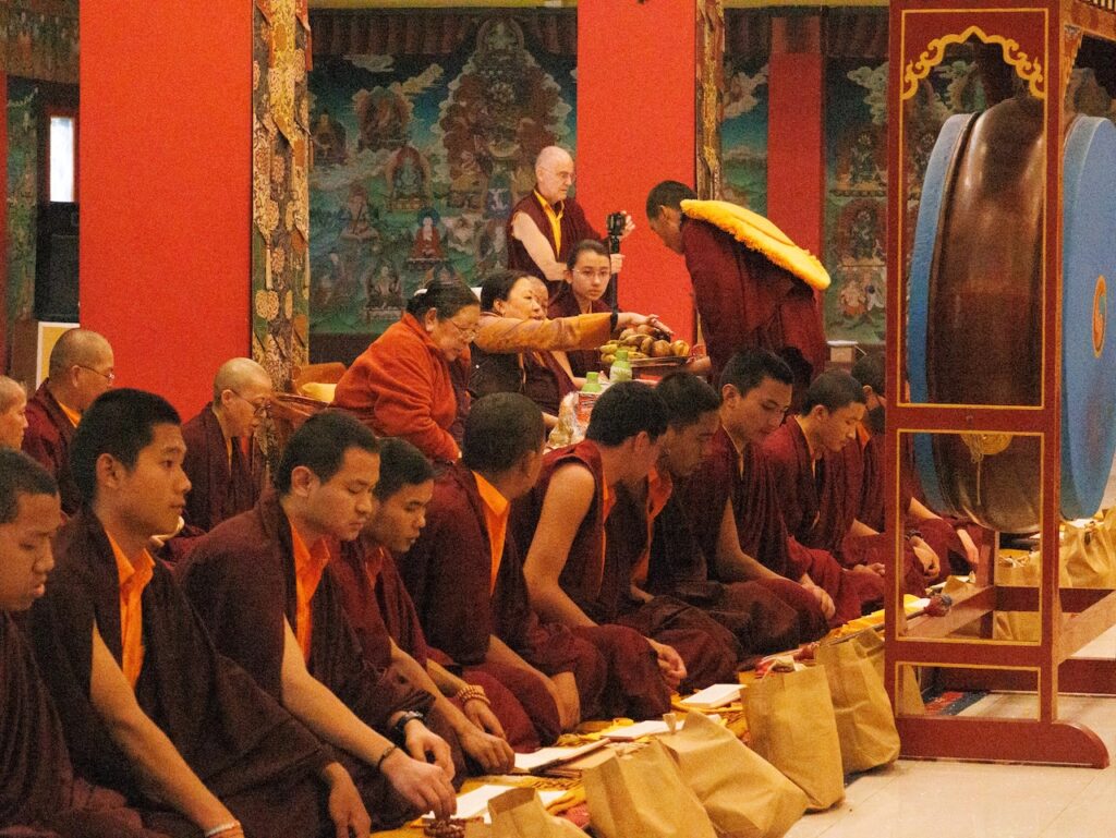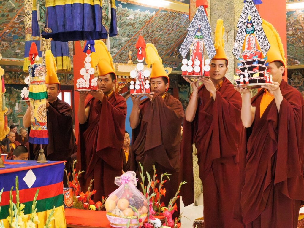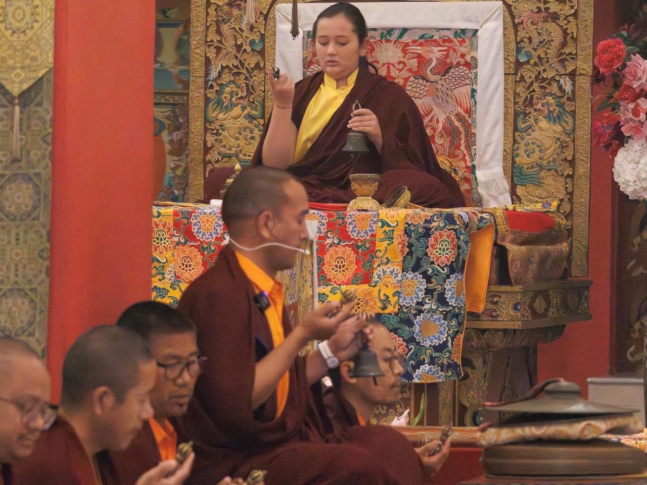 On the third day of Losar of the year of the Fire Horse, 2026, the sangha of Mindrolling gathered to make vast offerings of ganachakra (feast offerings) to mark the anniversary of the parinirvana of Kyabje Minling Trichen.  The assembly was led by Minling Dungse Rinpoche and included Minling Jetsün Rinpoche, Minling Jetsün Khandro Rinpoche, Minling Jetsün Dechen Paldrön, Sangyum Kushog, Venerable Khentrul Marpa Rinpoche and the other Mindrolling tulkus, khenpos, and monks, as well as nuns of Samten Tse, and Mindrolling International sangha members.  Many more sangha members who could not attend in person joined the practice on the internet by live stream.  The entire assembly joined together with great devotion to accomplish the vast ganacakra