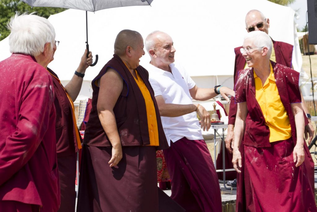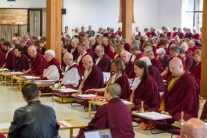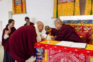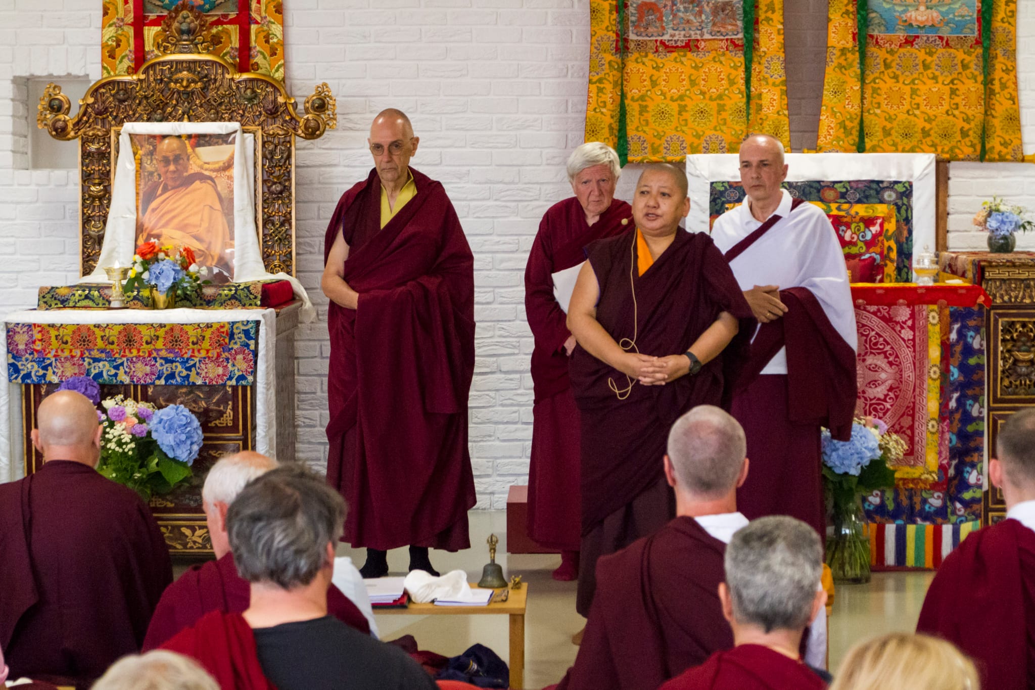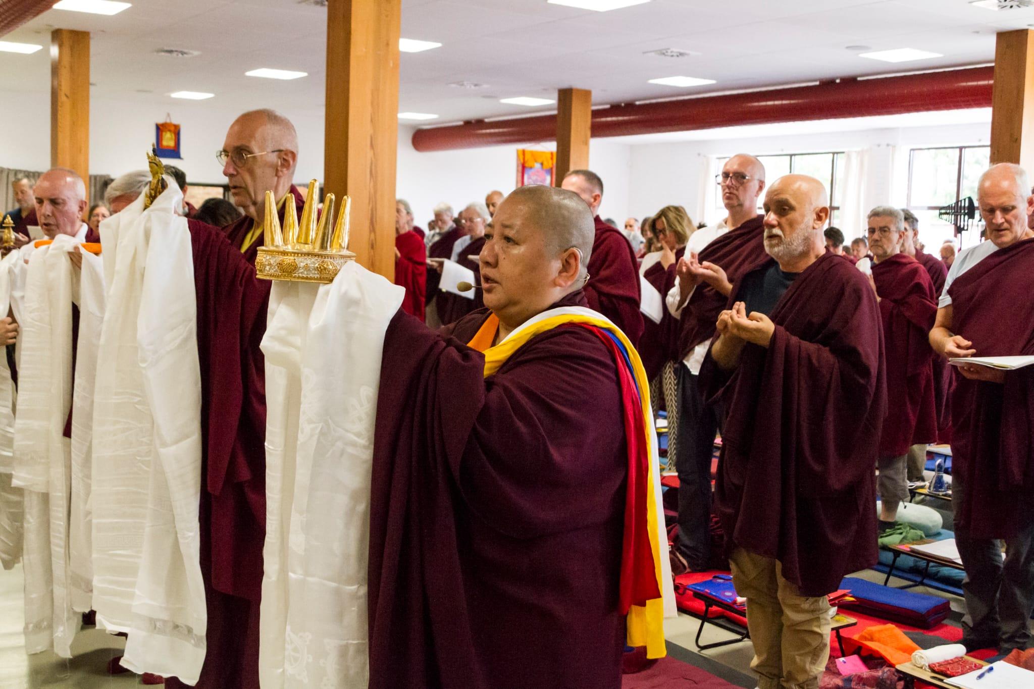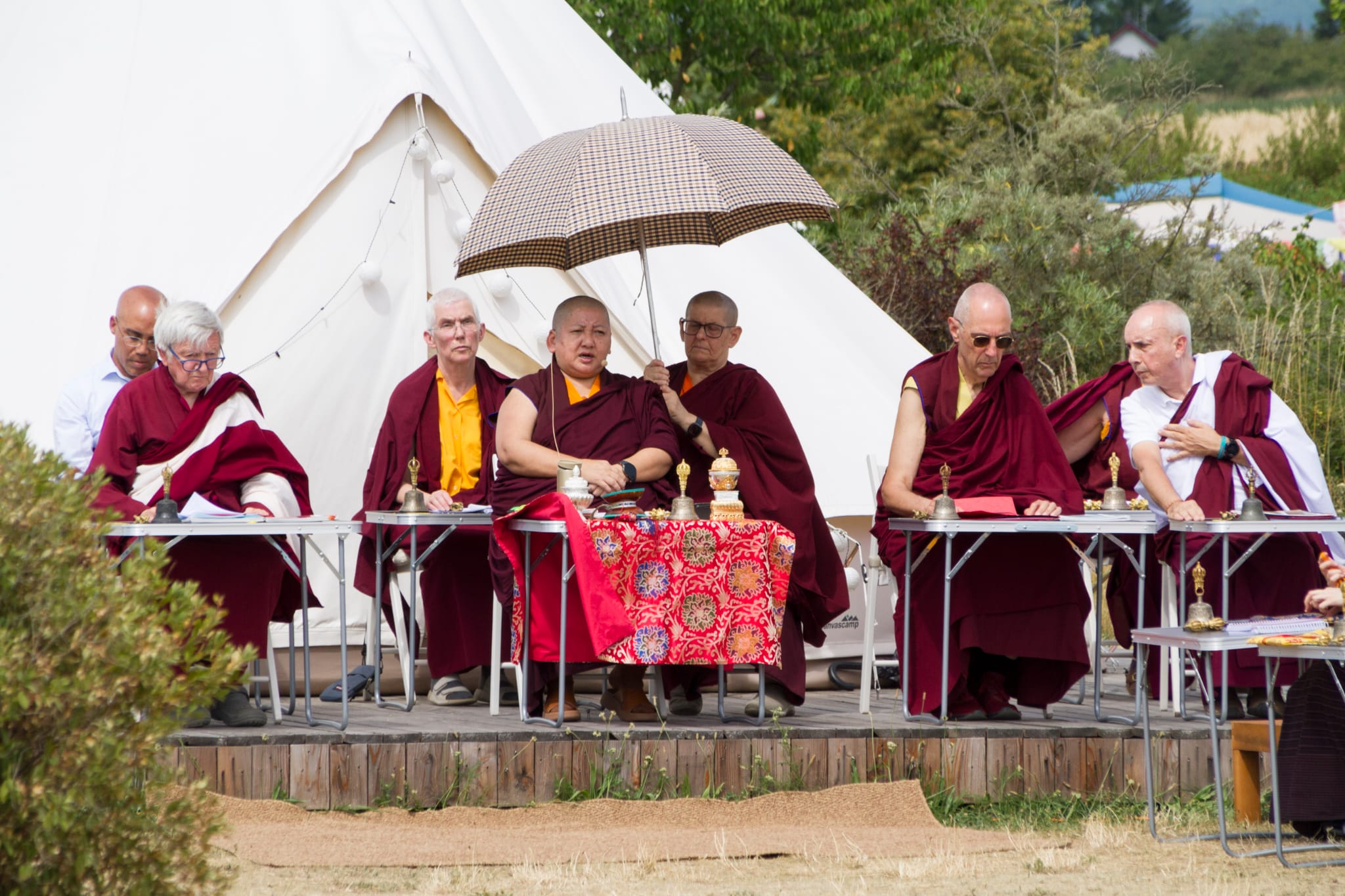 Having received such teachings and engaged in the practices with fellow sangha members, all expressed their immense gratitude to our precious guru who tirelessly accomplishes every benefit for all beings. The assembly concluded the retreat by making vast offerings of mandala and body, speech, and mind.