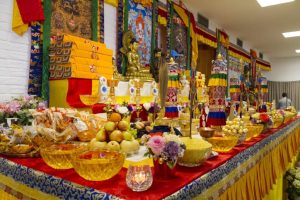 At the conclusion of the retreat, Rinpoche led the gathered sangha in the tshog offering to Guru Rinpoche, and the worldwide sangha also joined by live stream from their own homes in performing the ganachakra offering. With an array of vast offerings in shrine rooms spanning the world, the sangha practiced as one at the feet of the guru.